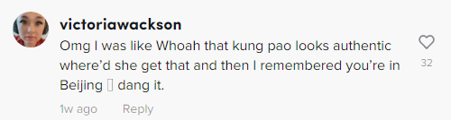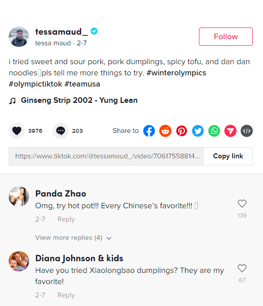 “我吃過糖醋里脊、豬肉餃子、麻婆豆腐和擔(dān)擔(dān)面。請告訴我更多可以嘗試的美食,”她在Tiktok上問道。粉絲們立刻在評論區(qū)列出了一系列人氣中國菜。