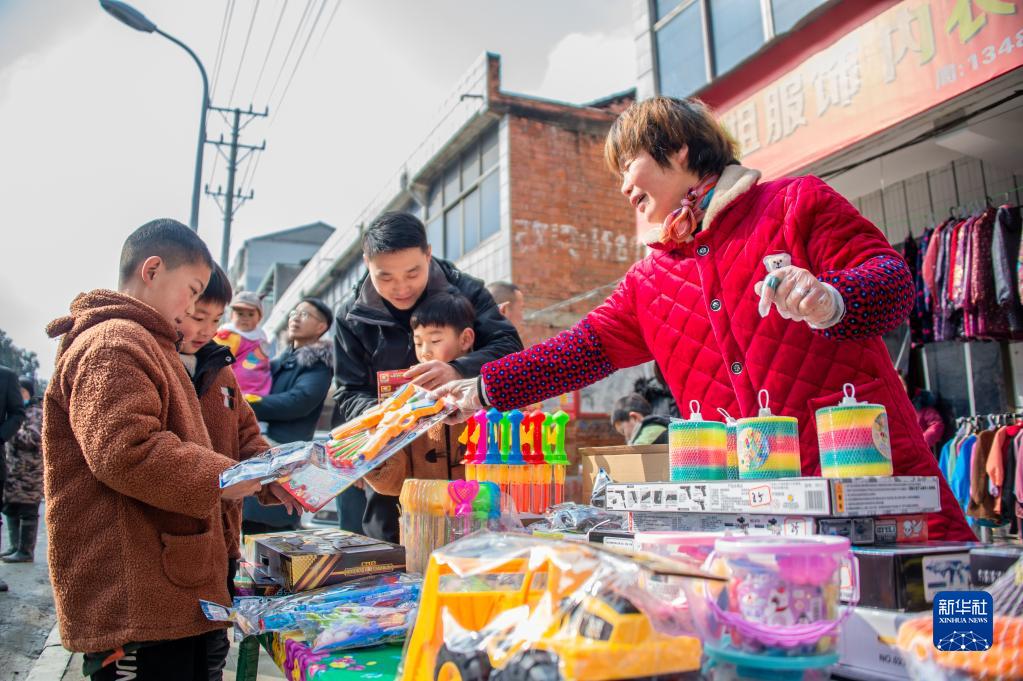 1月29日,小朋友在湖北省隨縣柳林鎮(zhèn)街頭的一個(gè)玩具攤前選購?fù)婢。新華社發(fā)(伍志尊 攝)