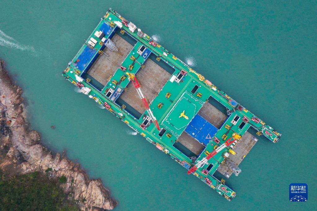 1月14日,中交一航局的“一航津安1”號沉管運(yùn)輸安裝一體船搭載E16管節(jié)準(zhǔn)備浮運(yùn)前往珠江口伶仃洋安裝現(xiàn)場(無人機(jī)照片)。新華社記者 劉大偉 攝