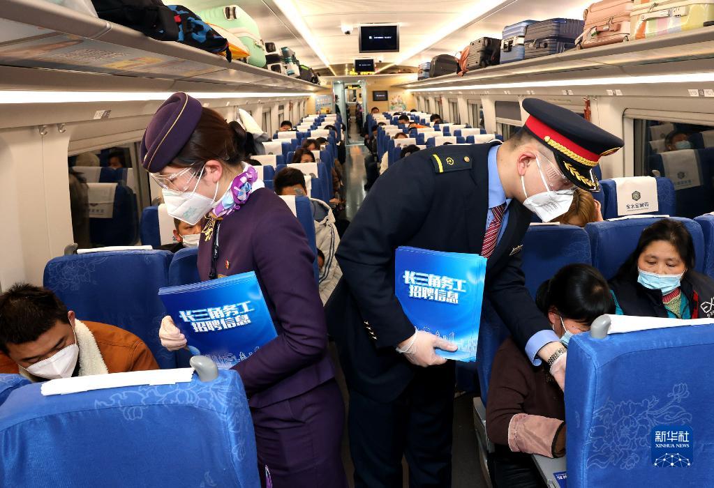 2月12日,列車乘務(wù)員在重慶開往上海的G1334次列車上,向春運(yùn)返程務(wù)工人員發(fā)放招聘信息。新華社記者 陳飛 攝