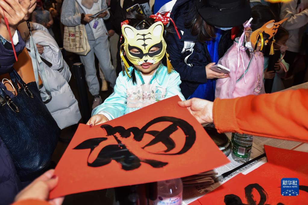 2月15日,在清華大學(xué)藝術(shù)博物館元宵節(jié)夜場活動上,佩戴虎頭面具的小朋友領(lǐng)取現(xiàn)場書寫的“!弊。新華社記者 陳鐘昊 攝