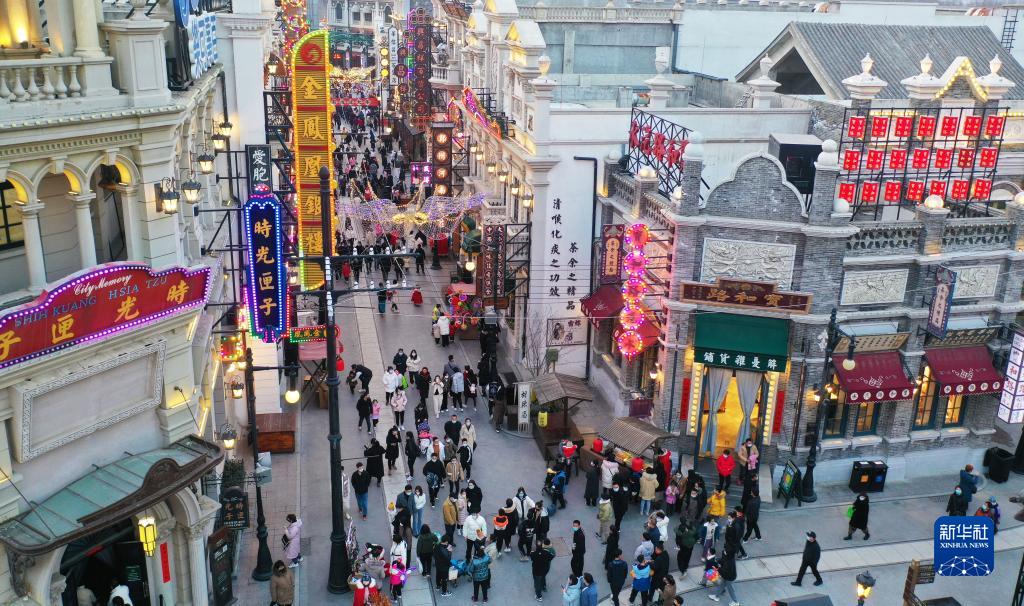 2月5日,游客在河南鄭州建業(yè)·華誼兄弟電影小鎮(zhèn)游覽(無人機(jī)照片)。新華社記者 張浩然 攝