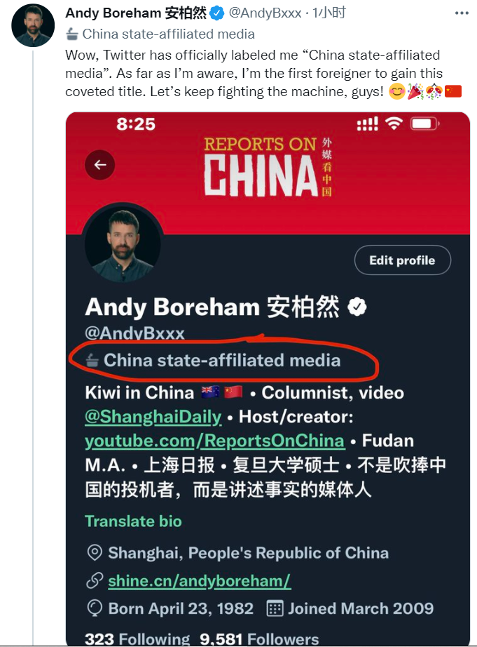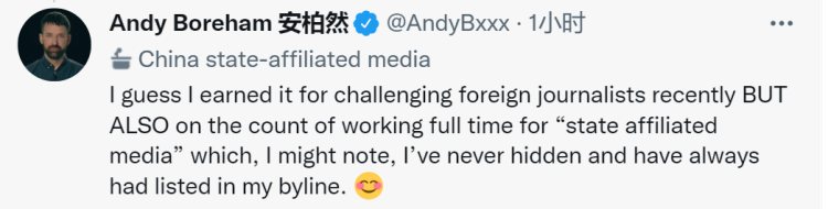 已經(jīng)在中國生活十年的Andy Boreham(中文名安柏然)是一名新西蘭人,目前在上海日報任職,在復旦大學留學期間,他有過在多家中國媒體實習的經(jīng)歷。“不是吹捧中國的投機者,而是講述事實的媒體人”一直都是他在社交平臺推特上的自我介紹。