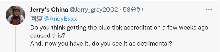 有網(wǎng)友問:“你認為,是幾周前獲得的藍勾認證導致了這一切嗎?現(xiàn)在你有了(這一標簽),你認為它是否是有害的?”↓