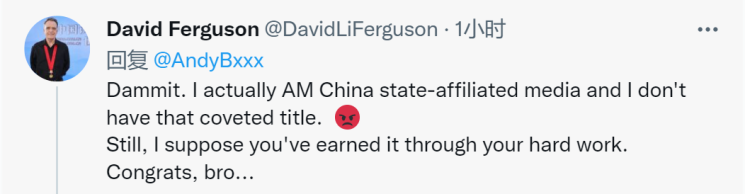 來自英國的大衛(wèi)·弗格森是中國外文局外文出版社資深翻譯改稿專家,他也在安柏然這條推文下評論,“該死的。我實際上才是中國官方媒體,我卻沒有那個令人垂涎的頭銜。不過,我想這是你辛苦工作換來的。恭喜,兄弟……”↓
