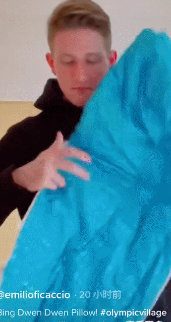 埃米利奧19日還向網(wǎng)友們展示了運動員房間里的“冰墩墩枕頭”,只要拉開拉鏈,就能變身成一個小被子,“這太好玩啦”。
