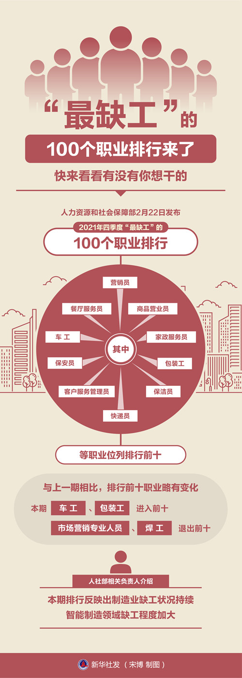 新華社北京2月22日電(記者馮家順、姜琳)人力資源和社會(huì)保障部22日發(fā)布2021年四季度“最缺工”的100個(gè)職業(yè)排行,其中,營(yíng)銷員、餐廳服務(wù)員、商品營(yíng)業(yè)員、車工、家政服務(wù)員、保安員、包裝工、客戶服務(wù)管理員、保潔員、快遞員等職業(yè)位列排行前十。