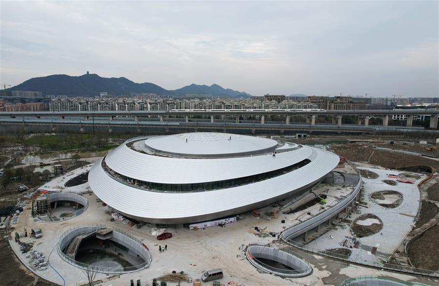 從空中俯瞰即將竣工的杭州亞運會電競館(無人機照片,2月23日攝)。
