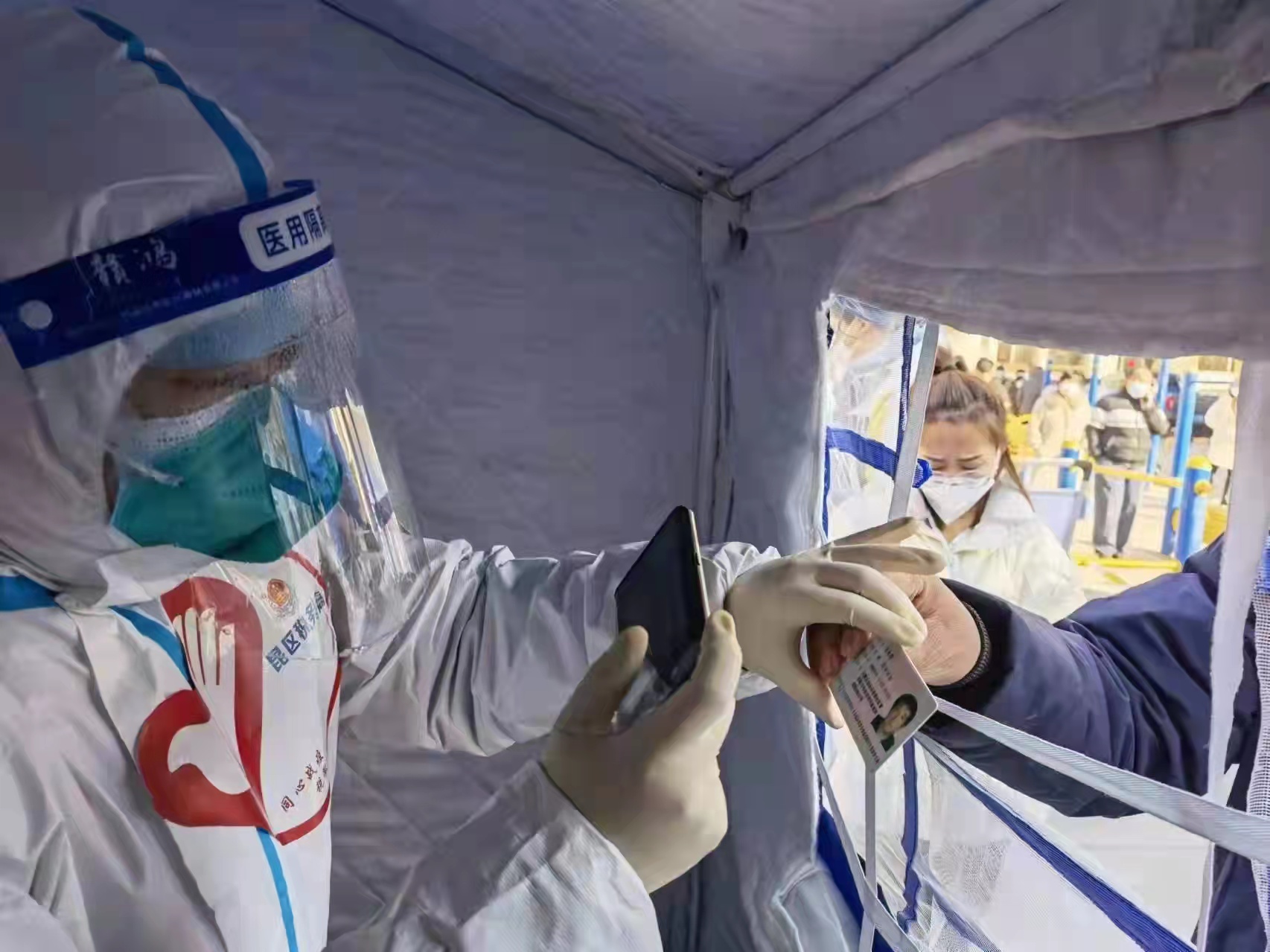 2月20日,內(nèi)蒙古包頭市疫情防控志愿者為做核酸檢測的居民錄入信息。(受訪者供圖)