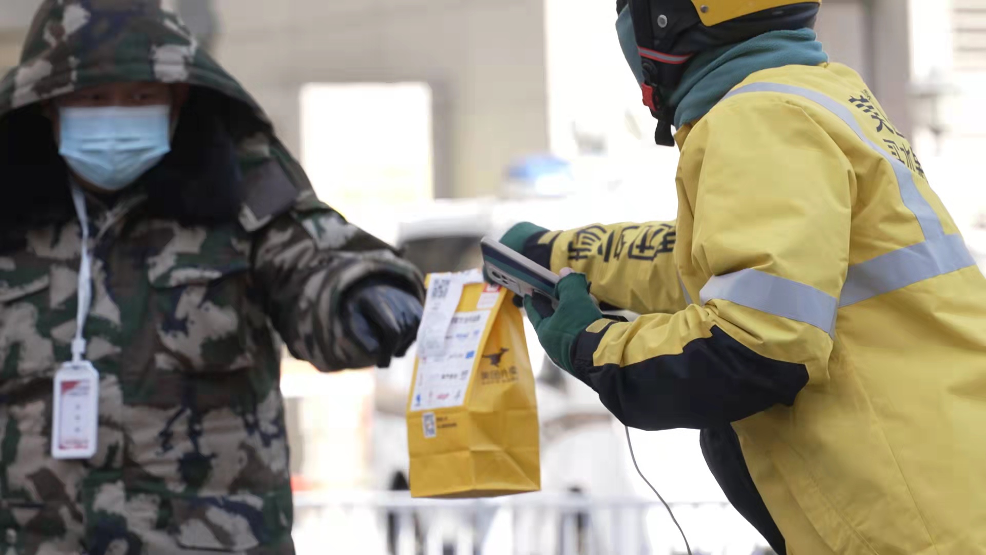 2月20日,內(nèi)蒙古呼和浩特市的外賣騎手將餐食交給疫情防控工作者。新華社記者達日罕 攝