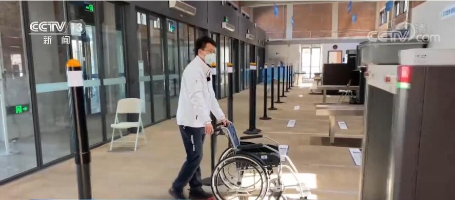 總臺記者 張景:這里是北京冬殘奧村的代表團(tuán)接待大廳,是各代表團(tuán)來村的第一站。為了方便坐輪椅人士快速安全通過,在安檢的環(huán)節(jié)不用過比較窄的安檢門,專門有綠色通道,有安保人員進(jìn)行手檢。