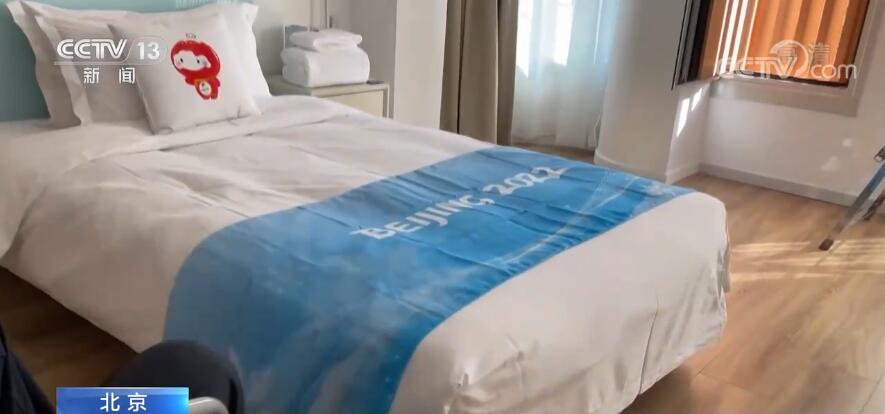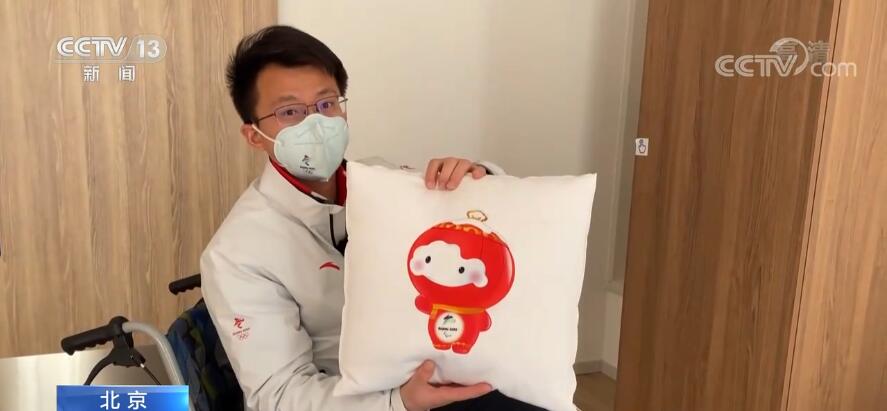 這是冬殘奧運(yùn)動員公寓的樣板間,有很多無障礙的設(shè)施。比如說,所有的門都是單臂可以操作的推拉門,還有扶手、浴凳等等。我們再來臥室里面看看,這是給坐輪椅運(yùn)動員使用的床,床腳相對于冬奧會的時(shí)候降低了10公分,便于上下床。我們看到床頭有一個(gè)抱枕。這面是北京冬殘奧會的會徽“飛躍”,這一面是北京冬殘奧會的吉祥物“雪容融”。(抱枕)打開之后就能成為一個(gè)毯子,有冬殘奧會各項(xiàng)目的運(yùn)動圖標(biāo),這個(gè)抱枕到時(shí)候是送給運(yùn)動員。