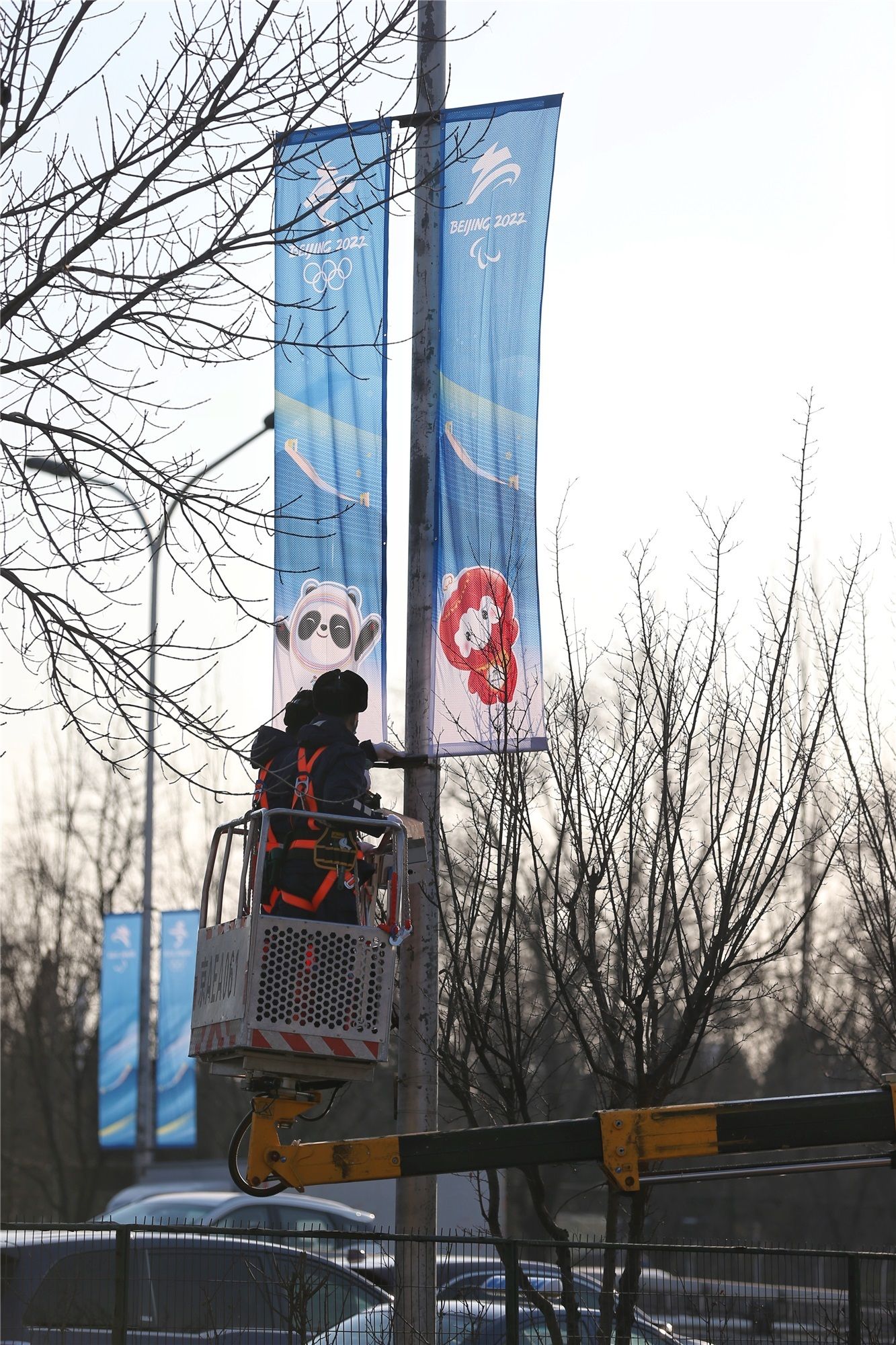 2月24日,北京北四環(huán),工作人員摘下冬奧會(huì)的紅色道旗,更換為冬殘奧會(huì)使用的藍(lán)色道旗。