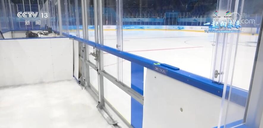 國(guó)家體育館場(chǎng)館運(yùn)行團(tuán)隊(duì)媒體副主任 潘忠民:運(yùn)動(dòng)員時(shí)刻要關(guān)注場(chǎng)上的變化,一旦到換人的時(shí)候,他這冰橇打開就出去了,所以這個(gè)地方必須是做透明的。同時(shí)為了做得精細(xì),就是里面的冰厚度跟這個(gè)(賽場(chǎng)上)冰面的厚度一樣高,不影響他出去。