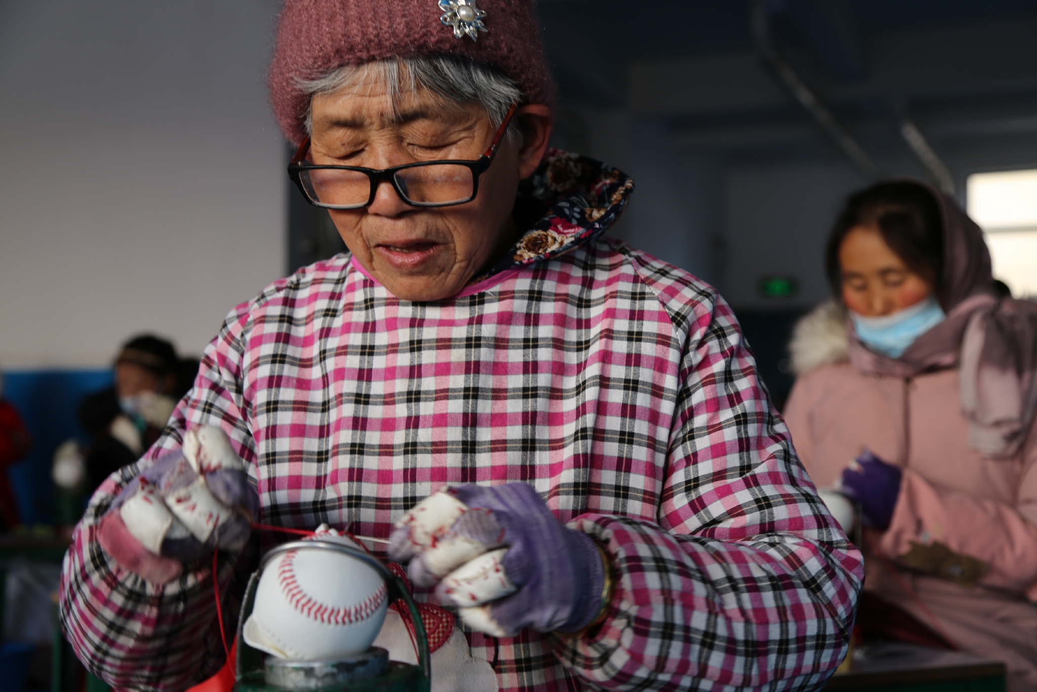 云南會澤縣搬遷群眾正在制作棒球。(李榮山攝)
