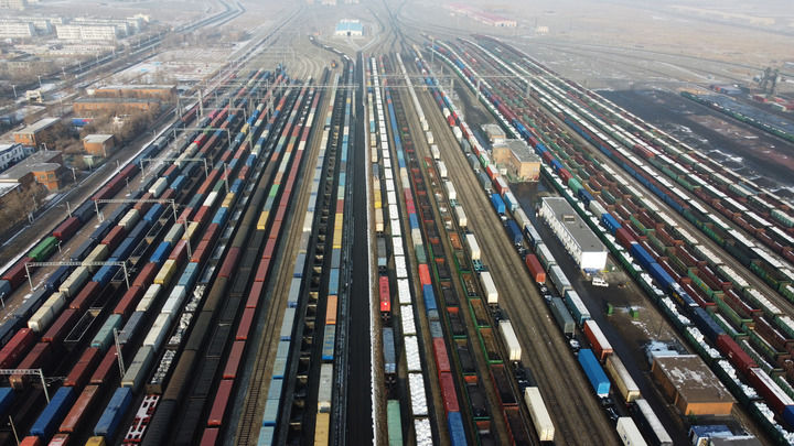 新疆阿拉山口口岸內(nèi)出入境班列正集結(jié)出發(fā)。新華社照片