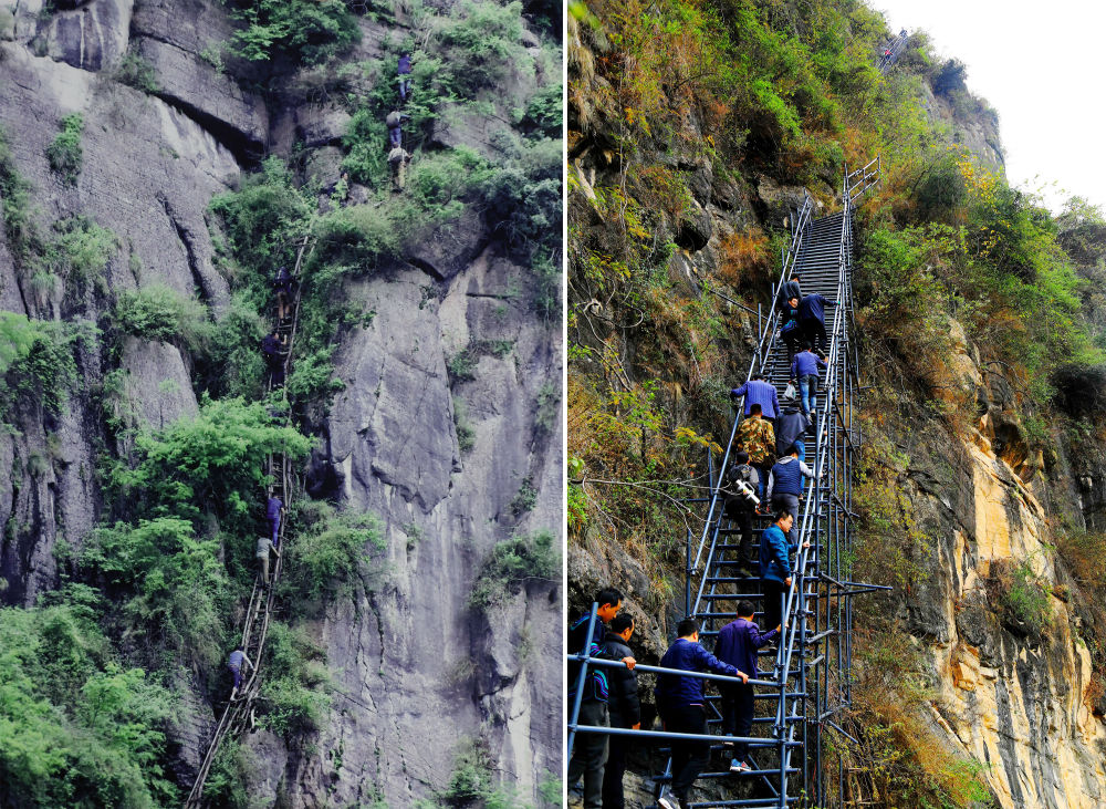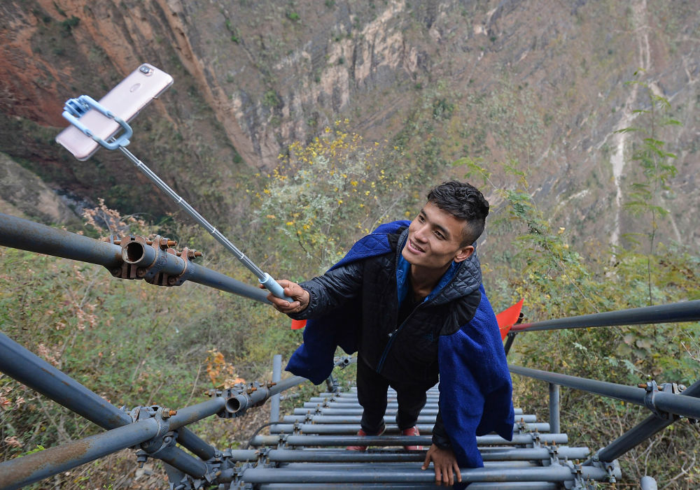 ↑某色蘇不惹在通往“懸崖村”的鋼梯上直播(2017年12月15日攝)。