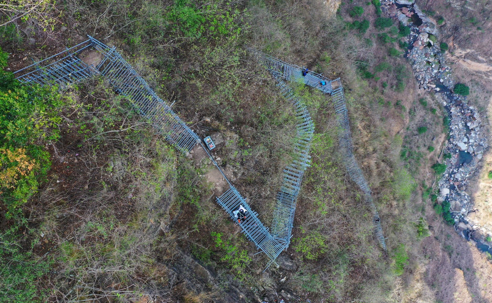 ↑在四川省涼山彝族自治州昭覺縣阿土列爾村的懸崖鋼梯上,村民沿著鋼梯下山(2020年5月13日攝,無人機(jī)照片)。