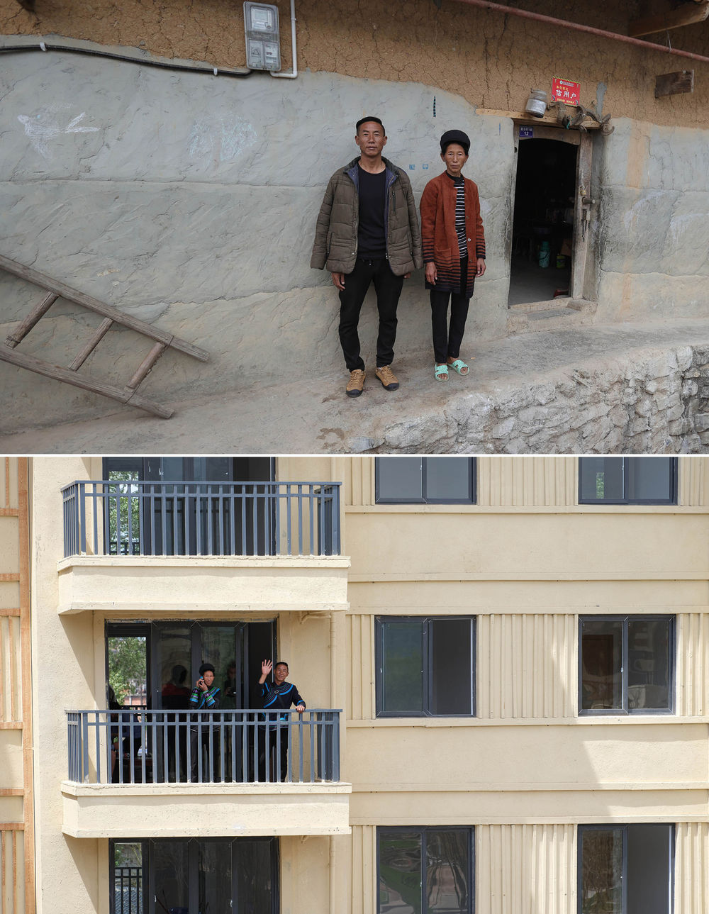 ↑拼版照片:上圖為四川省昭覺縣阿土列爾村村民某色達(dá)體夫婦在“懸崖村”的家門口拍照留念(2020年5月13日攝);下圖為某色達(dá)體夫婦在昭覺縣城易地扶貧搬遷安置點南坪社區(qū)新家的陽臺上揮手(2020年5月13日攝)。