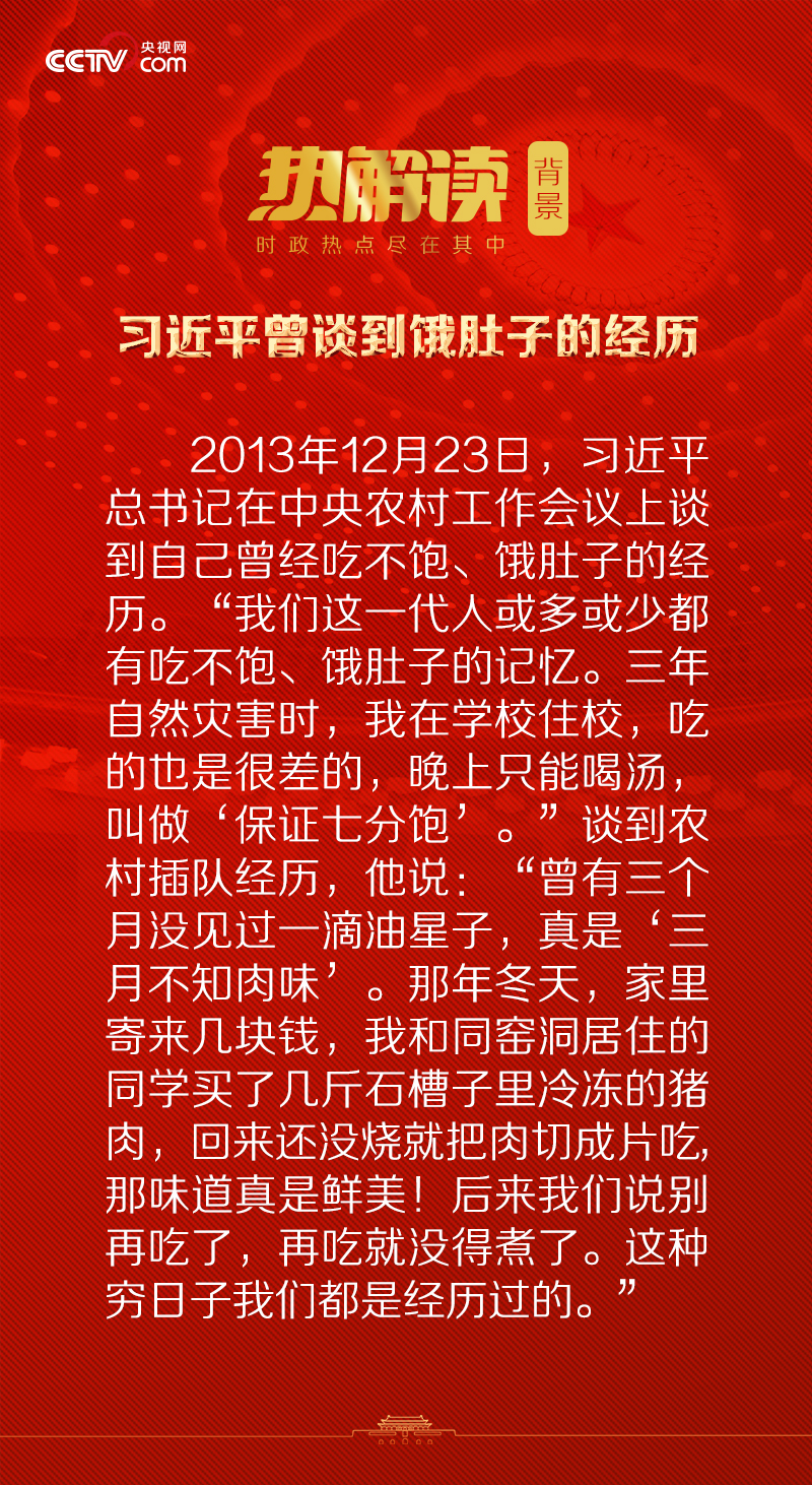 在本次聯(lián)組會(huì)上,總書(shū)記憶苦思甜,動(dòng)情回憶以往勒緊褲腰帶的苦日子。這不是總書(shū)記第一次回憶“餓肚子”的苦日子,強(qiáng)調(diào)糧食安全的重要性。