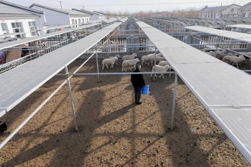 聯(lián)星村村民在自家的光伏庭院里飼養(yǎng)羊群(2018年1月22日攝)。新華社記者劉磊攝