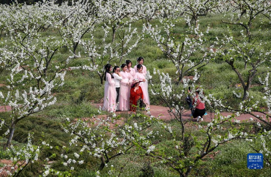 3月11日,在四川省宜賓市高縣勝天鎮(zhèn),幾名女士在李花叢中留影。