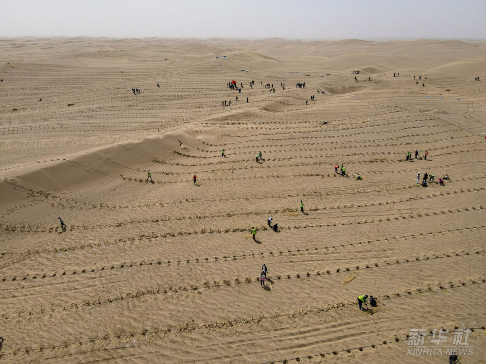 在甘肅省古浪縣北部沙區(qū)旱麻崗治沙點,八步沙林場治沙人和群眾一起扎草方格壓沙(無人機照片,2020年3月6日攝)。