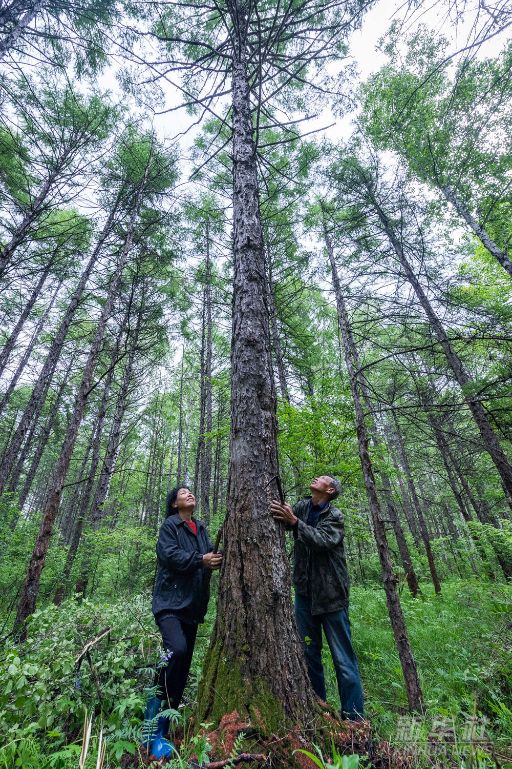 2021年6月3日,在黑龍江省伊春市烏馬河林業(yè)局有限公司烏馬河林場分公司施業(yè)區(qū),張英善、燕玉平夫婦查看他們30多年前種下的樹。幾十年來,夫妻二人親手栽下100多萬株樹。