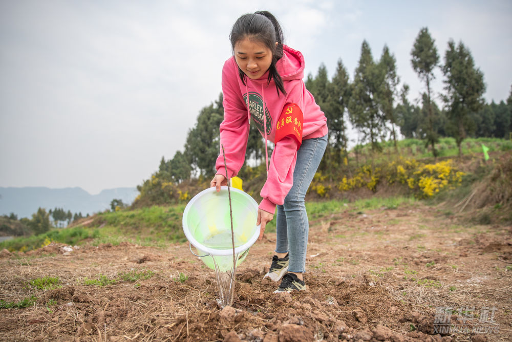 2022年3月10日,在重慶市渝北區(qū)木耳鎮(zhèn)金剛村,參加助農(nóng)植樹活動的志愿者為剛栽種的樹苗澆水。