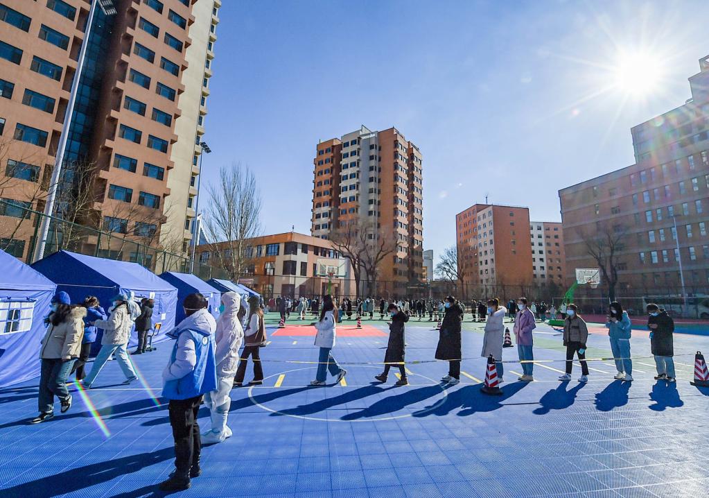 3月2日,內(nèi)蒙古醫(yī)科大學(xué)學(xué)生在校園內(nèi)排隊(duì)做核酸檢測(cè)。新華社記者 彭源 攝