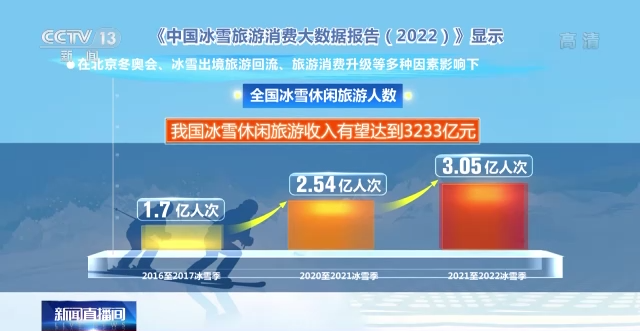 中國旅游研究院今年初發(fā)布的《中國冰雪旅游消費(fèi)大數(shù)據(jù)報(bào)告(2022)》顯示,在北京冬奧會、冰雪出境旅游回流、旅游消費(fèi)升級等多種因素影響下,全國冰雪休閑旅游人數(shù)從2016至2017冰雪季的1.7億人次增加至2020至2021冰雪季的2.54億人次,預(yù)計(jì)2021至2022冰雪季將達(dá)到3.05億人次,我國冰雪休閑旅游收入有望達(dá)到3233億元。