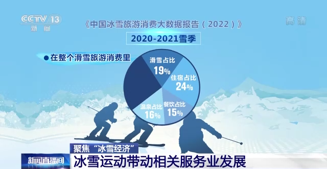 場館數(shù)量的增加,直接帶動場地維護(hù)、餐飲住宿等服務(wù)業(yè)的發(fā)展!吨袊┞糜蜗M(fèi)大數(shù)據(jù)報(bào)告(2022)》顯示,在整個(gè)滑雪旅游消費(fèi)里,滑雪占比為19%,住宿占比24%,餐飲占比15%,溫泉占比16%。