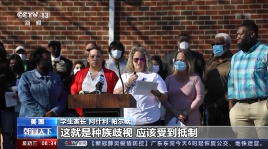 學(xué)生家長(zhǎng) 阿什利·帕爾默:這不是我們第一次面對(duì)針對(duì)我們孩子的種族主義行為了,這不是什么多元化與包容性,也不是(種族)平等,這就是種族歧視,應(yīng)該受到抵制。