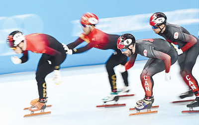 2月11日,北京2022年冬奧會短道速滑項目男子5000米接力半決賽在首都體育館舉行。圖為加拿大隊隊員查爾斯哈梅林(右二)在比賽中。新華社發(fā)