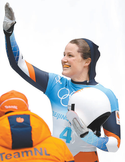 2月12日,北京2022年冬奧會女子鋼架雪車比賽在國家雪車雪橇中心舉行。圖為獲得季軍的荷蘭選手金伯莉博斯在賽后致意。新華社發(fā)