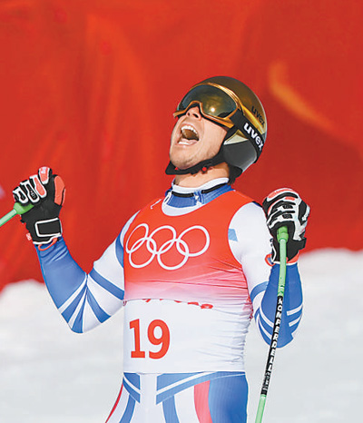 2月7日,北京2022年冬奧會高山滑雪男子滑降項目比賽在延慶國家高山滑雪中心舉行。圖為獲得亞軍的法國選手約翰克拉雷在賽后慶祝。新華社發(fā)