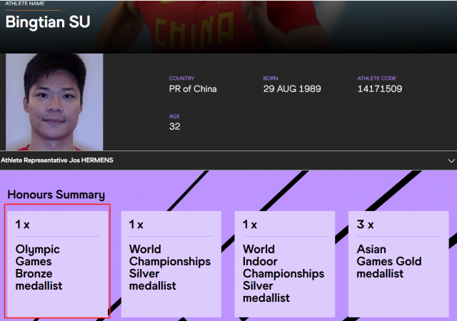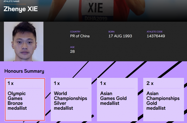 據(jù)國際田聯(lián)官網(wǎng)信息,國際田聯(lián)的運(yùn)動(dòng)員介紹中,蘇炳添、謝震業(yè)、吳智強(qiáng)、湯星強(qiáng)的資料上都標(biāo)注了奧運(yùn)會(huì)銅牌。恭喜中國接力隊(duì)!