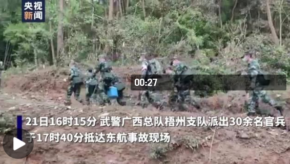3月21日下午,東方航空公司一架客機(jī)在廣西梧州市上空失聯(lián)并墜毀。事故發(fā)生后,武警廣西總隊(duì)第一時(shí)間分析研判形勢(shì),安排部署救援行動(dòng),協(xié)調(diào)保障,并成立前指深入救援一線,加強(qiáng)現(xiàn)場(chǎng)指揮。21日16時(shí)15分,武警廣西總隊(duì)梧州支隊(duì)與地方應(yīng)急管理部門對(duì)接,派出30余名官兵攜鐵鏟、救生繩、救援包等物資先期出發(fā),于17時(shí)40分抵達(dá)救援現(xiàn)場(chǎng)。截至21日21時(shí)許,共有80余名武警官兵先后到達(dá)救援現(xiàn)場(chǎng),火速投入到封控、搜救、清理現(xiàn)場(chǎng)等工作中。(總臺(tái)記者 廖汨 劉暢)