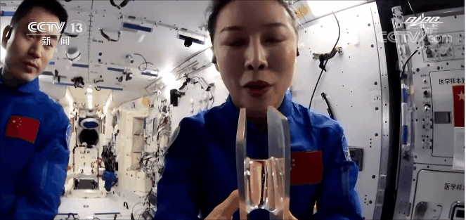 液橋演示實驗,向同學們演示失重環(huán)境下水的表面張力作用。