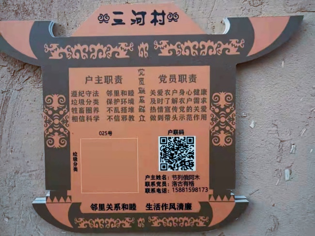“我們把‘戶聯(lián)碼’引入了三河村,以三河村家庭為單位,給每戶農(nóng)戶建立一個‘戶聯(lián)碼’,并張貼于農(nóng)戶家門口!睋(jù)浙江援川掛職干部、寧波余姚駐昭覺工作組成員、昭覺政府辦副主任鄔海濱介紹,“戶聯(lián)碼”系統(tǒng)承載了農(nóng)戶家庭的多種信息,也內(nèi)置了多種應用可與村委、其他村民及游客進行在線互動。