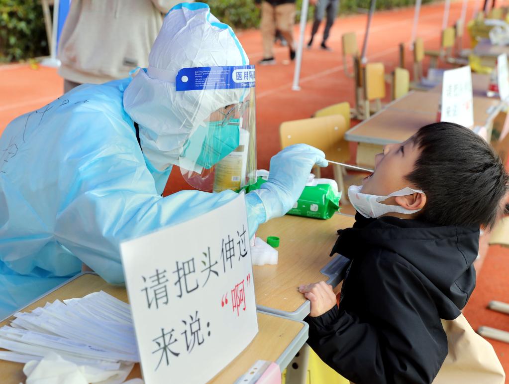 檢測(cè)人員為上?党蔷用襁M(jìn)行核酸采樣(新華社記者劉穎攝)