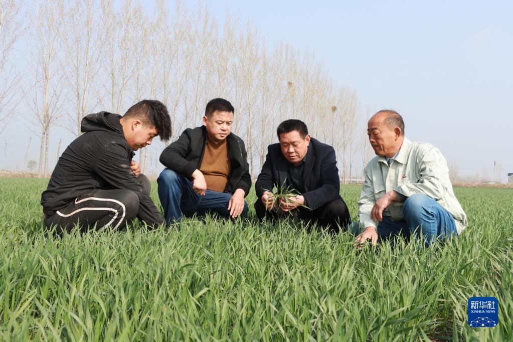 這是山東汶上縣苑莊鎮(zhèn)道立種植農(nóng)民專(zhuān)業(yè)合作社理事長(zhǎng)張道立(右二)與同事查看苗情(3月24日攝)。新華社發(fā)