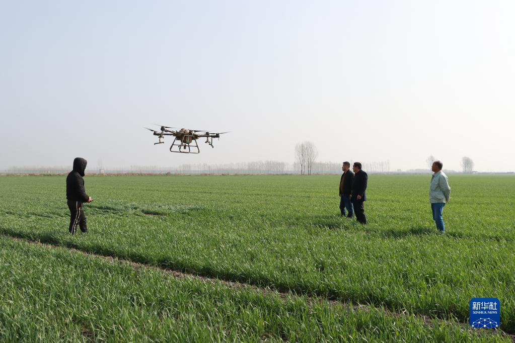 這是山東汶上縣苑莊鎮(zhèn)道立種植農(nóng)民專(zhuān)業(yè)合作社社員用農(nóng)用無(wú)人機(jī)噴灑農(nóng)藥(3月24日攝)。新華社發(fā)(劉娜攝)