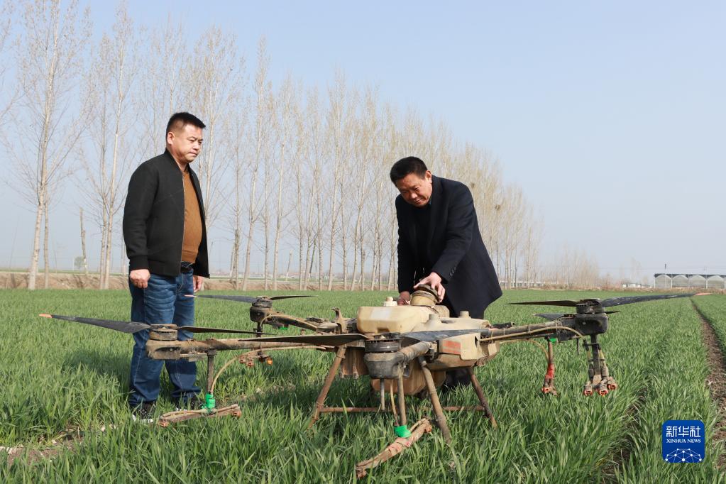 這是山東汶上縣苑莊鎮(zhèn)道立種植農(nóng)民專(zhuān)業(yè)合作社理事長(zhǎng)張道立(右)查看農(nóng)用無(wú)人機(jī)(3月24日攝)。新華社發(fā)(劉娜攝)