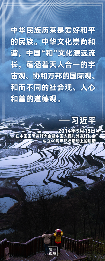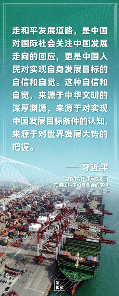 中國走和平發(fā)展道路,不是權(quán)宜之計,更不是外交辭令,而是從歷史、現(xiàn)實(shí)、未來的客觀判斷中得出的結(jié)論,是思想自信和實(shí)踐自覺的有機(jī)統(tǒng)一。進(jìn)入新時代以來,習(xí)近平在多個場合,這樣闡述——