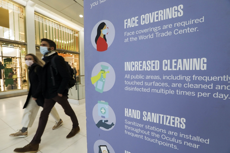 ↑3月29日,人們從美國紐約世貿(mào)中心車站內(nèi)的防疫提示牌旁走過。新華社記者 王迎 攝