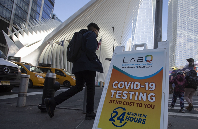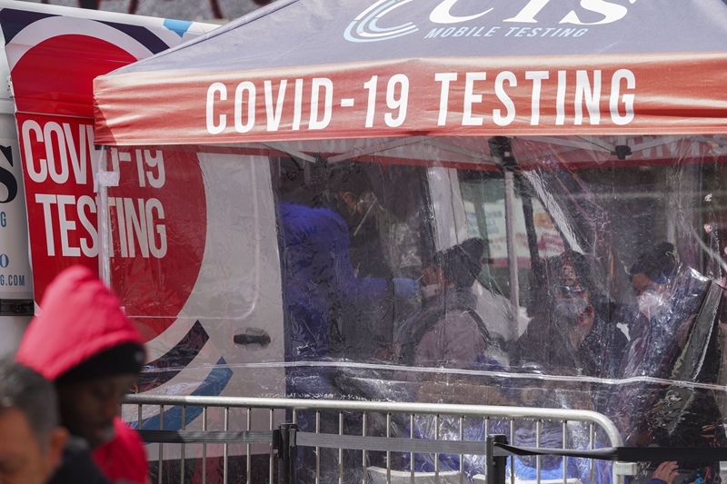 ↑3月29日,人們從美國紐約世貿(mào)中心車站外一個新冠病毒檢測點旁走過。新華社記者 王迎 攝