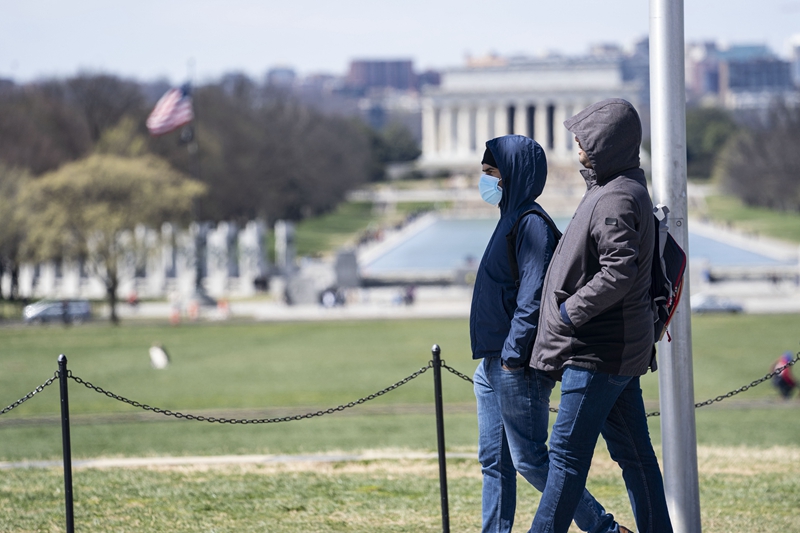 ↑3月29日,行人走在美國首都華盛頓的國家廣場。新華社記者 劉杰 攝
