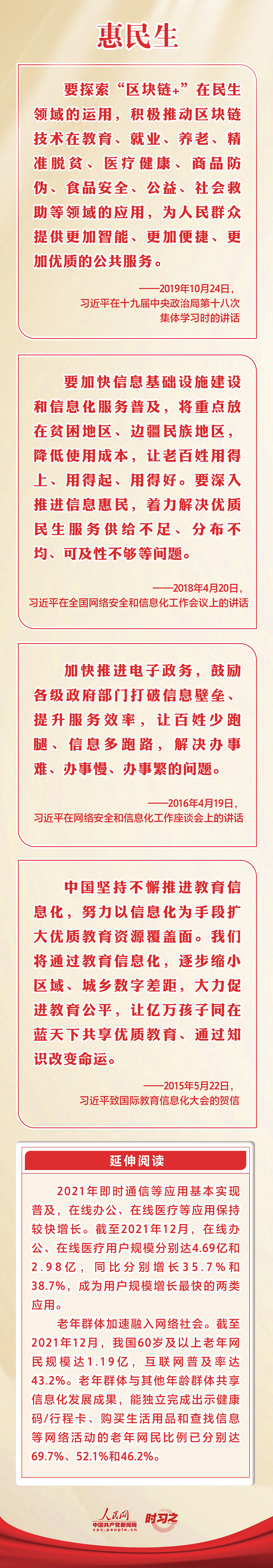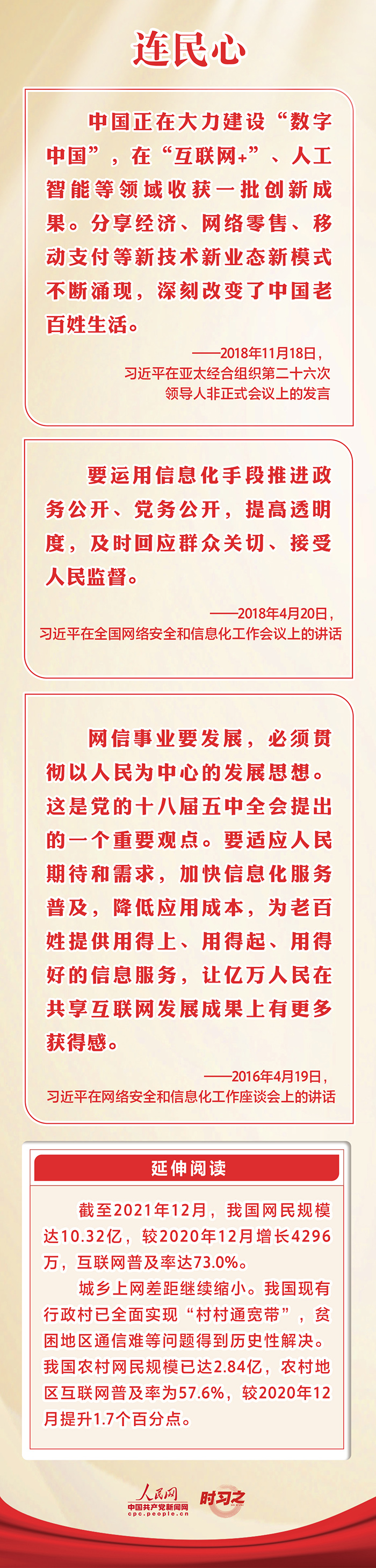 “網(wǎng)信事業(yè)要發(fā)展,必須貫徹以人民為中心的發(fā)展思想。”黨的十八大以來(lái),習(xí)近平總書記多次就網(wǎng)信事業(yè)發(fā)展作出重要論述。網(wǎng)絡(luò)惠民、人民為本,如何讓億萬(wàn)人民共享互聯(lián)網(wǎng)發(fā)展成果,人民二字是總書記一以貫之的牽掛。