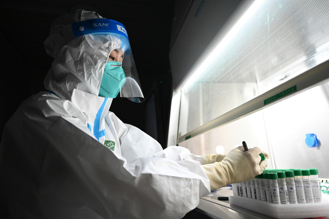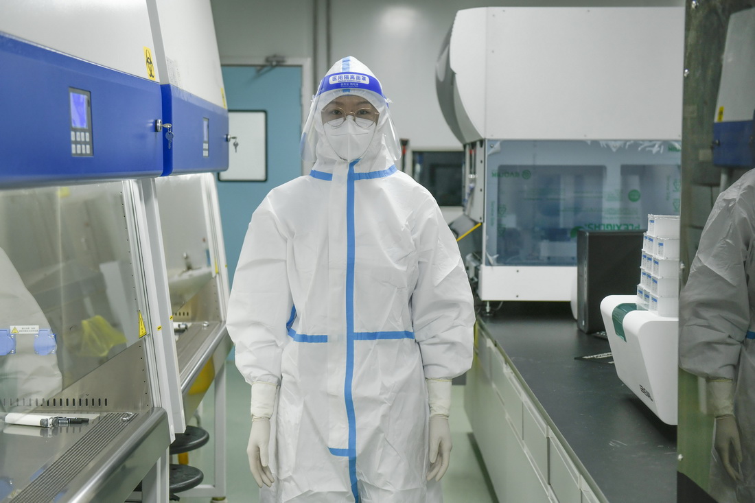 3月29日,在河北省遵化市人民醫(yī)院,穿戴防護(hù)服的核酸檢測(cè)員雷蕾在樣品處理區(qū)工作。新華社發(fā)(劉滿倉(cāng)攝)